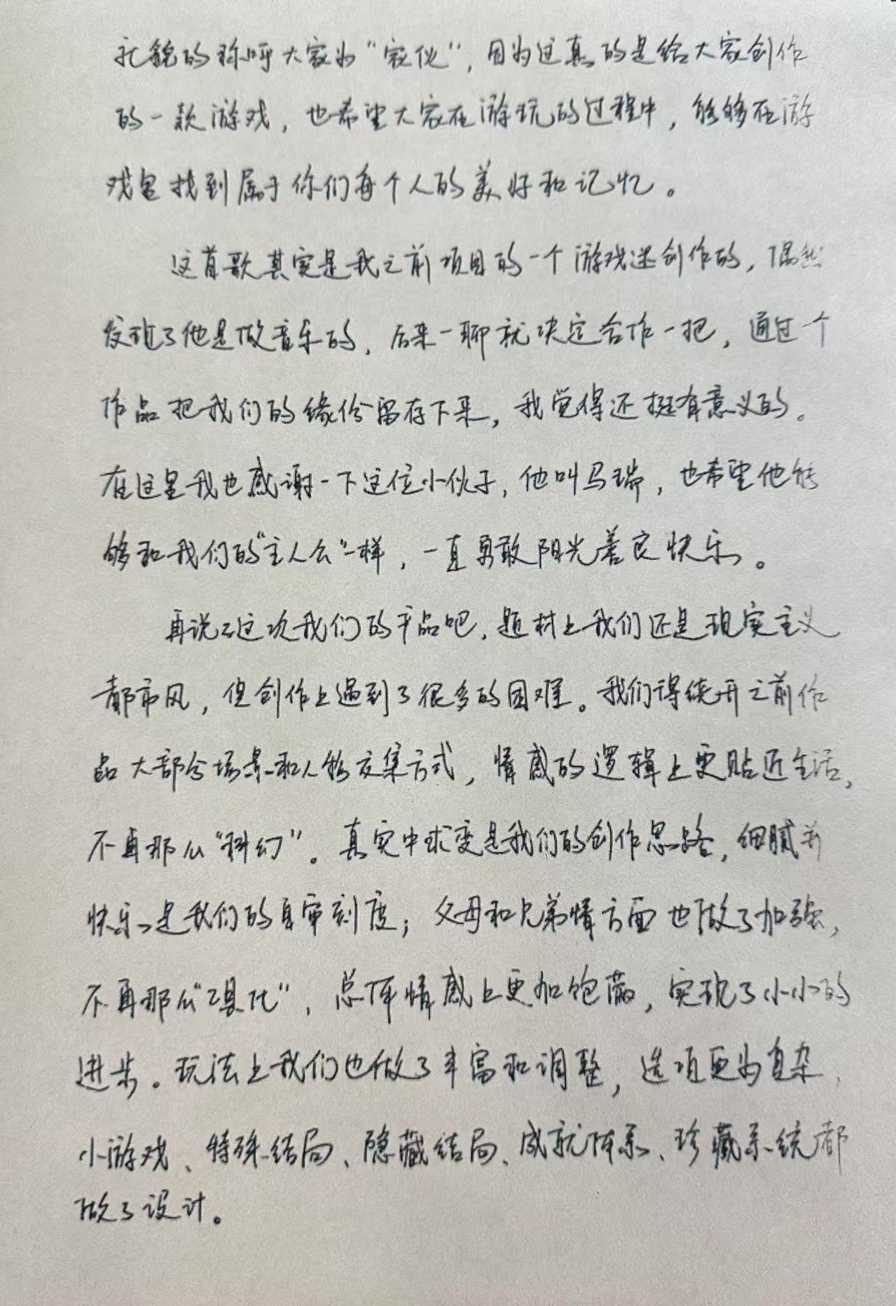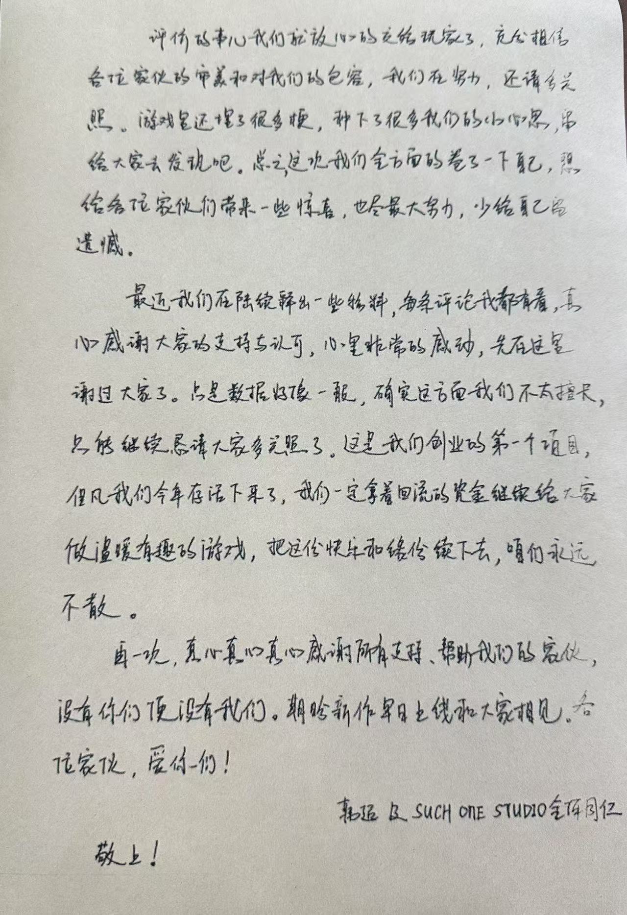 As for evaluation, I’ll happily leave that to you, our players. I trust your taste and your kindness. We’ve put in the effort, and we ask for your support. The game is full of Easter eggs and hidden touches we left for you to discover. This time, we really pushed ourselves hard, hoping to bring you surprises—and fewer regrets for ourselves.