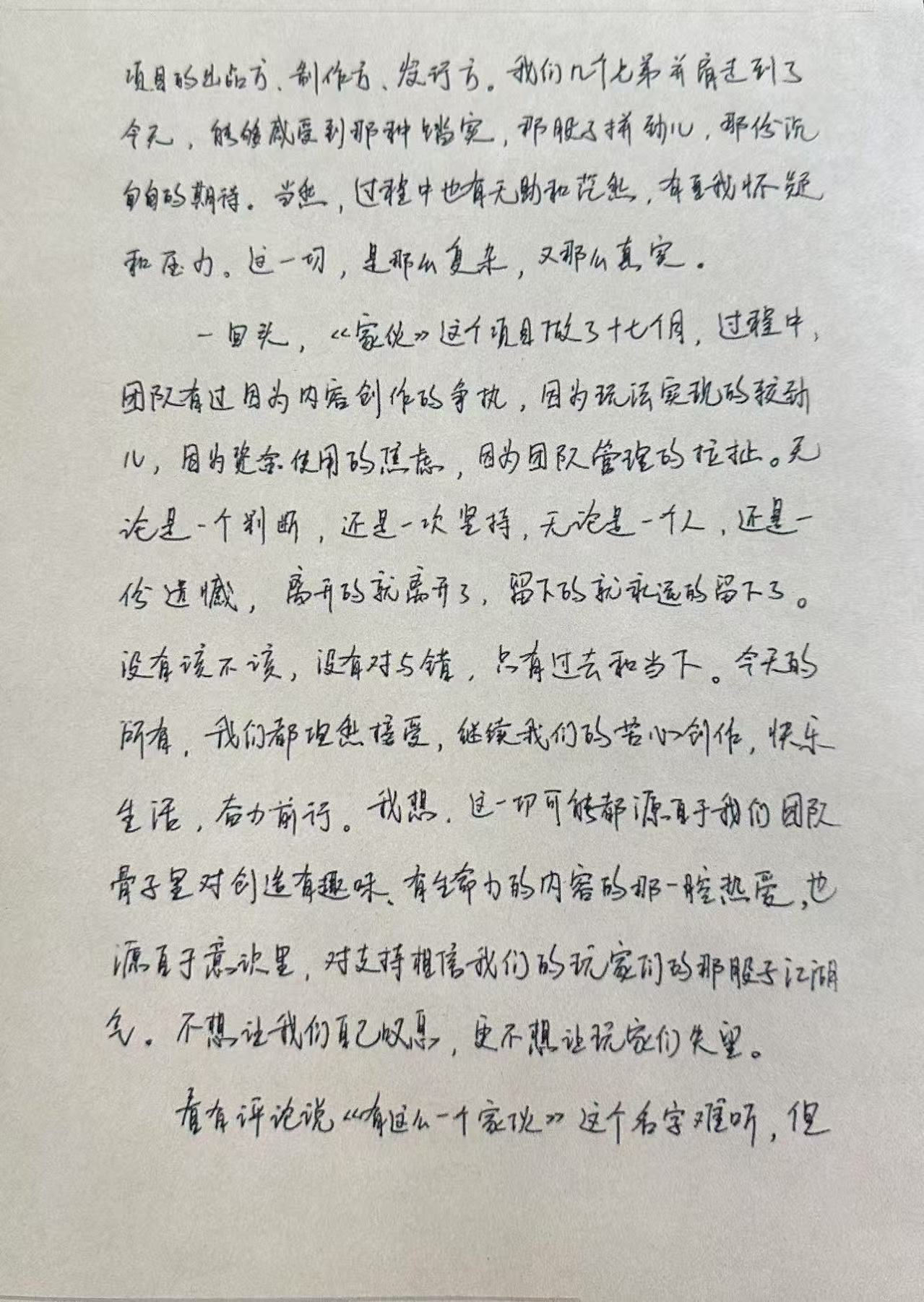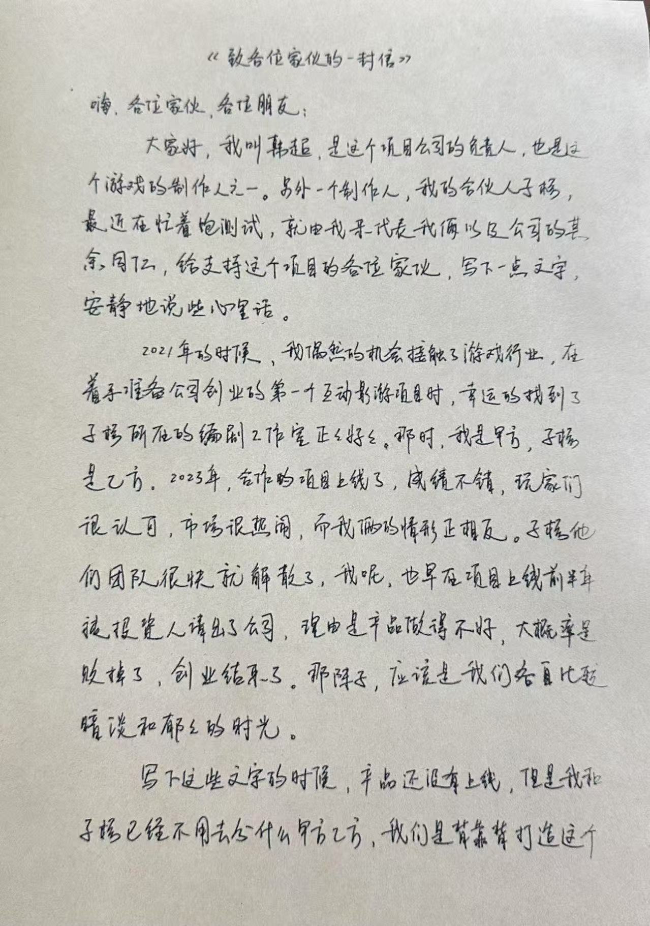 My name is Han Chao. I’m the head of this project company and also one of the producers of this game. My partner and fellow producer, Ziyang, has been busy running tests lately, so I’ll take this opportunity to represent the two of us and all our teammates in quietly sharing some heartfelt words with you, the supporters of this project.