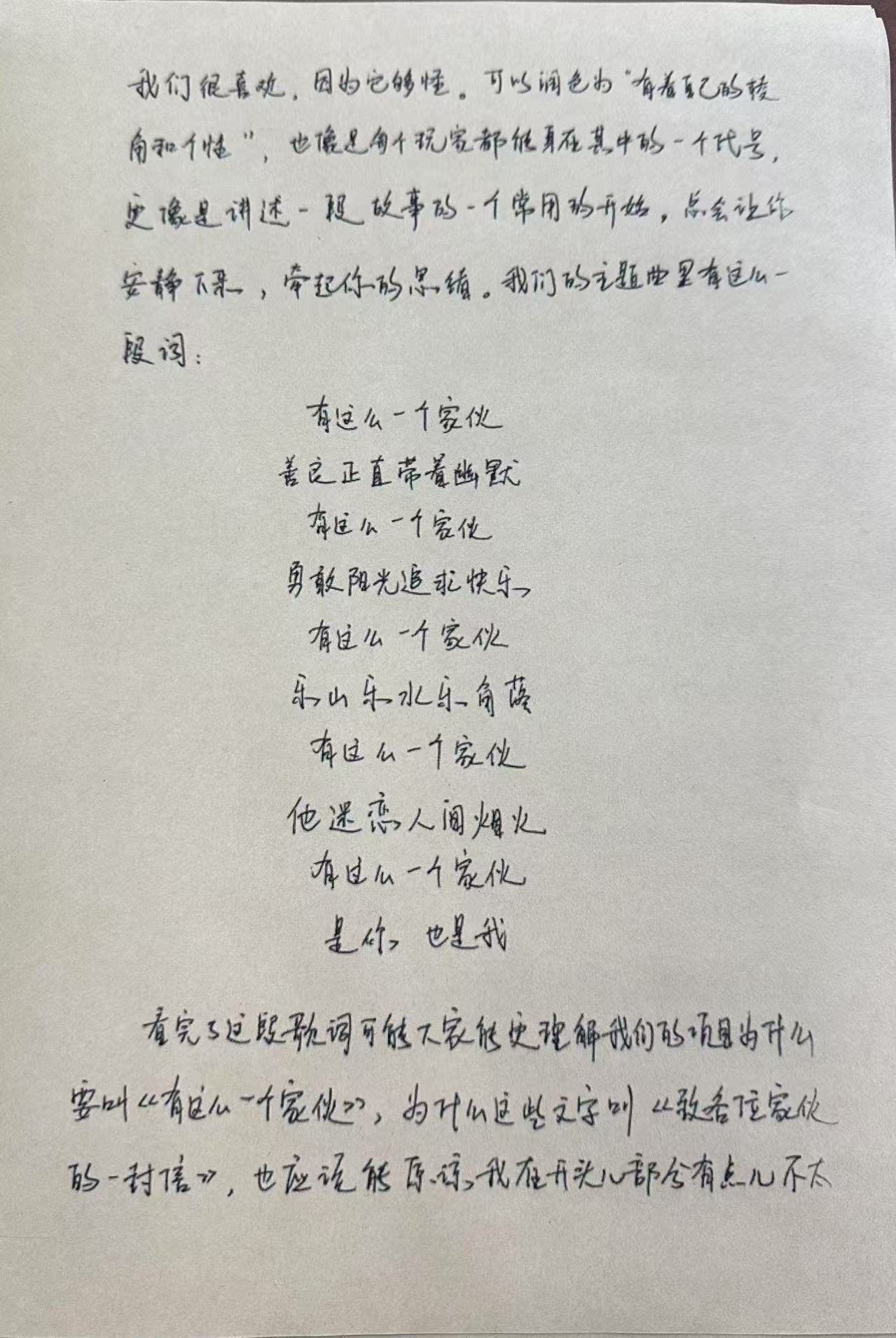 Maybe after reading these lyrics, you’ll better understand why our project is called Such a Guy, and why this letter is titled A Letter to All of You. You’ll also forgive me for calling you “guys” at the start—it really is a game we’re making for you, and we hope each of you finds your own joy and memories in it.