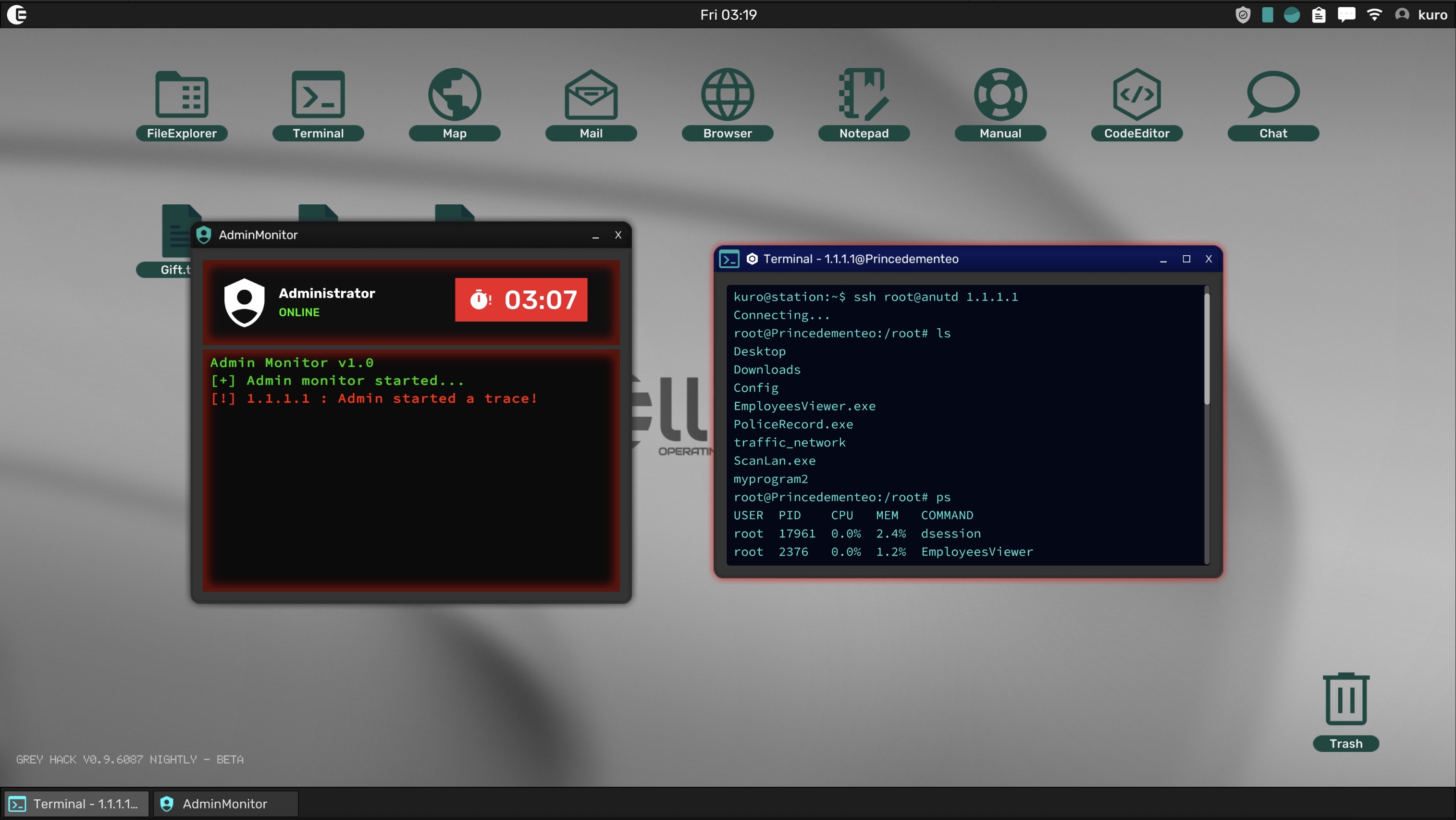 In the previous version of the game, the trace system did not work correctly especially the passive trace, causing many traces not to initiate. In this version both trace systems have been rewritten to work properly with the new bash system, so it is recommended that you take another look at the Manual in the Traces section to ensure you are erasing your tracks correctly. It is also recommended to open AdminMonitor.exe before making any connection to detect Active Traces.