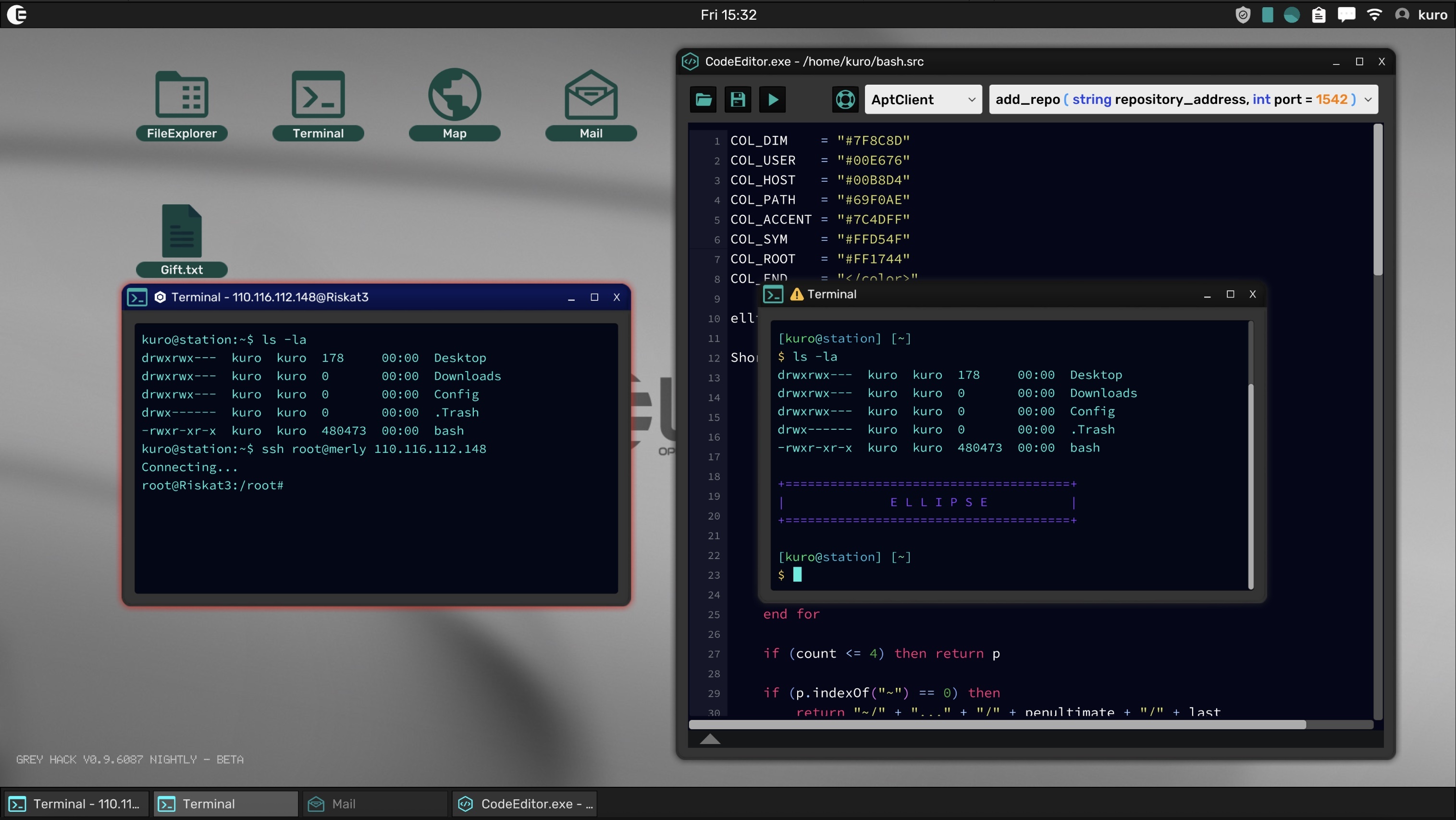This Bash migration improves security by closing potential exploits that could originate from the client side, as many variables that were previously exposed are now only available on the server side. It allows scripts created by players to integrate much better into the systems by eliminating the client part that interrupted the scripts when returning to the bash prompt, since technically we are now always executing a script the moment we open a terminal and it only ends when we close it.