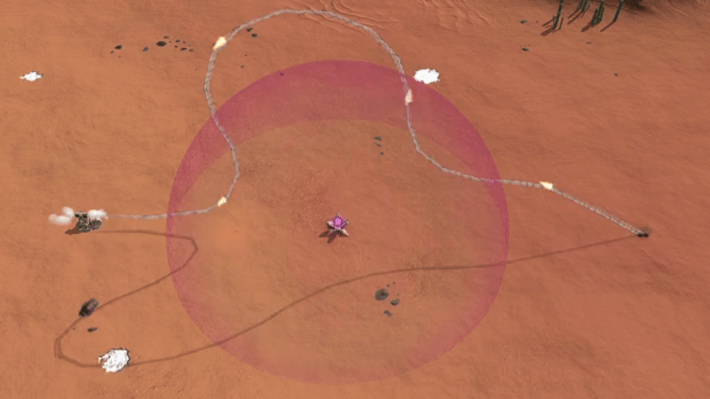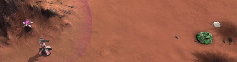 One important technicality is that projectiles explode on shields, and this can even damage units behind the shield. It has to be this way since blocking the area-of-effect (AoE) damage of explosions damage would be a nightmare, both computationally and intuitively. A shield that blocked explosion damage would also have to block damage from shots that hit the ground just outside the shield, otherwise units would be incentivised to fire at the ground rather than into the shield, which would look silly. But damage should not be blocked for free, which implies that nearby explosions should consume shield charge. How much charge? Well, explosion damage is reduced by distance, but there is the potential for shields to be stacked behind each other, so shields would have to be able to protect each other. This is further complicated by the fact that units can straddle shield boundaries, making it unclear what is being protected. So rather than block area of effect damage, we embrace the fact that AoE is effective against shields, especially smaller personal shields.