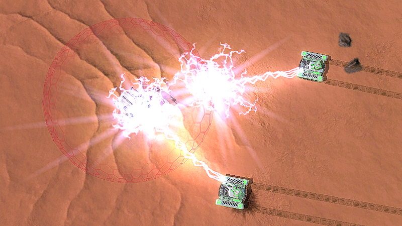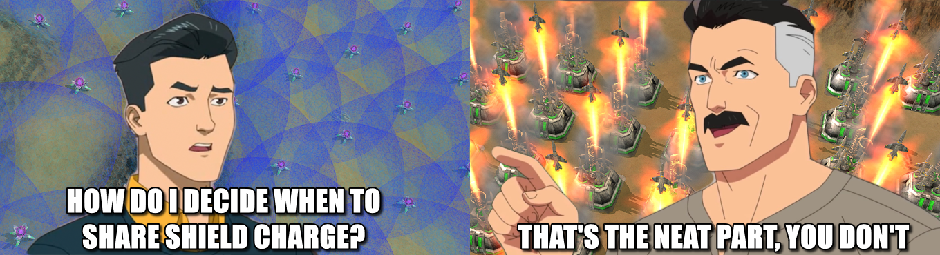The most unusual feature of Zero-K shields is something called shield link, which causes clusters of shields to gradually equalise their charge. It was most likely added to deal with the problem of wasted regeneration, since shields only regenerate when not fully charged. Minimising mid-combat regeneration is important when fighting shields, which can be achieved via focus fire. However, mobile shield generators can negate focus fire by dancing around so that each shield gets a turn at the front. This is a case of skipping the unit AI arms race by implementing the final result, so charge from high-charge shields flows to nearby shields of lower charge, leaving more space for regeneration.