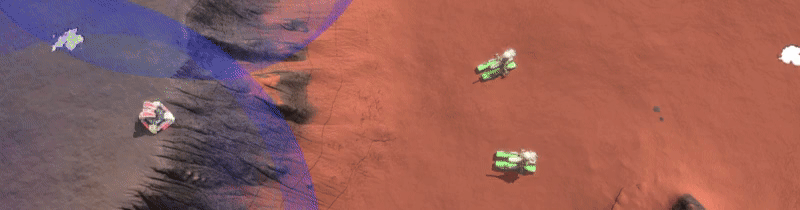 In the end, the fun physics had to be put aside, and shields became hard shells that block enemy projectiles. The projectiles are blocked by detonating them mid-air, and doing so costs shield charge equal to the damage of the projectile. If a shield has insufficient charge at the moment of impact, then the projectile is allowed through. Shields regenerate charge over time, and share charge around to try to equalise nearby shields. This is a fairly simple system, but there is enough to it to dial in some satisfying interactions.