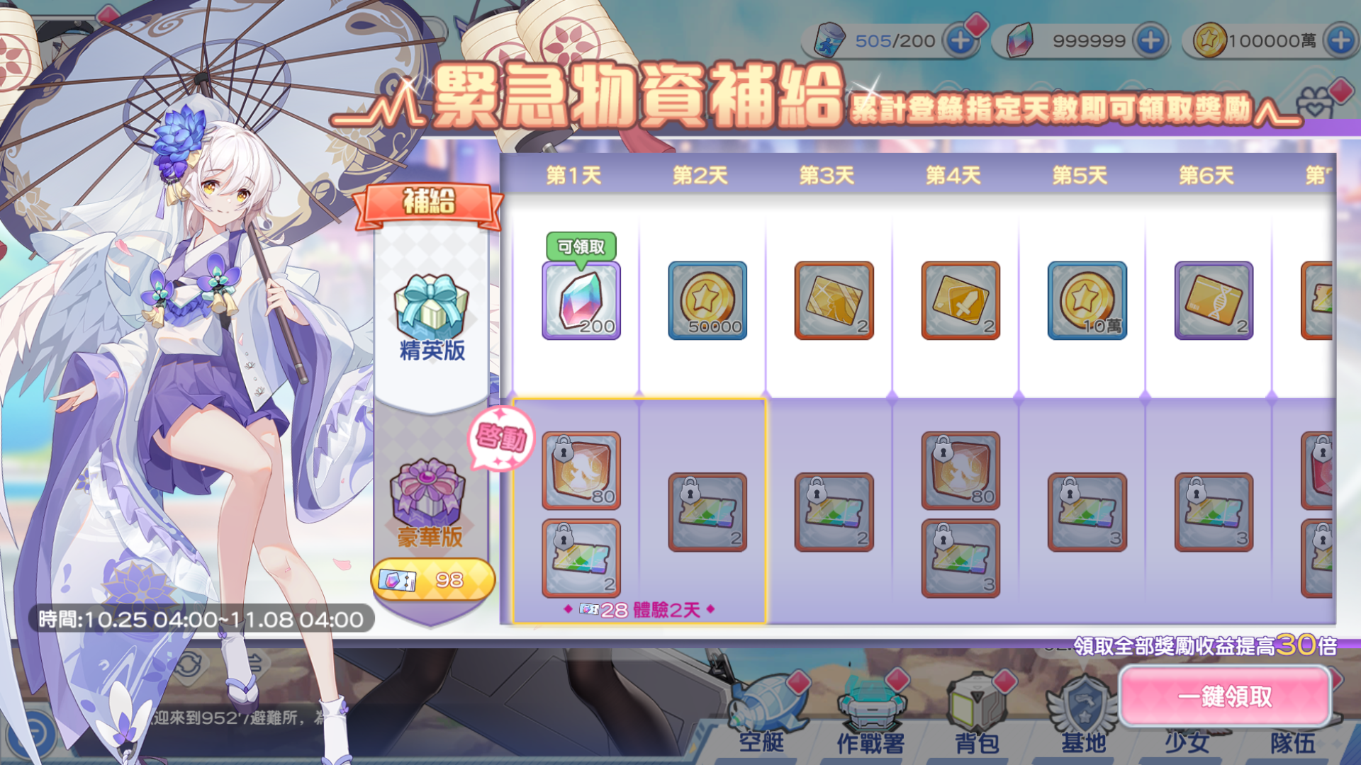 親愛的指揮官,登錄補給活動即將來臨,活動期間累計登錄即可領取相應獎勵,啟動豪華補給更可額外獲取稀有道具獎勵~