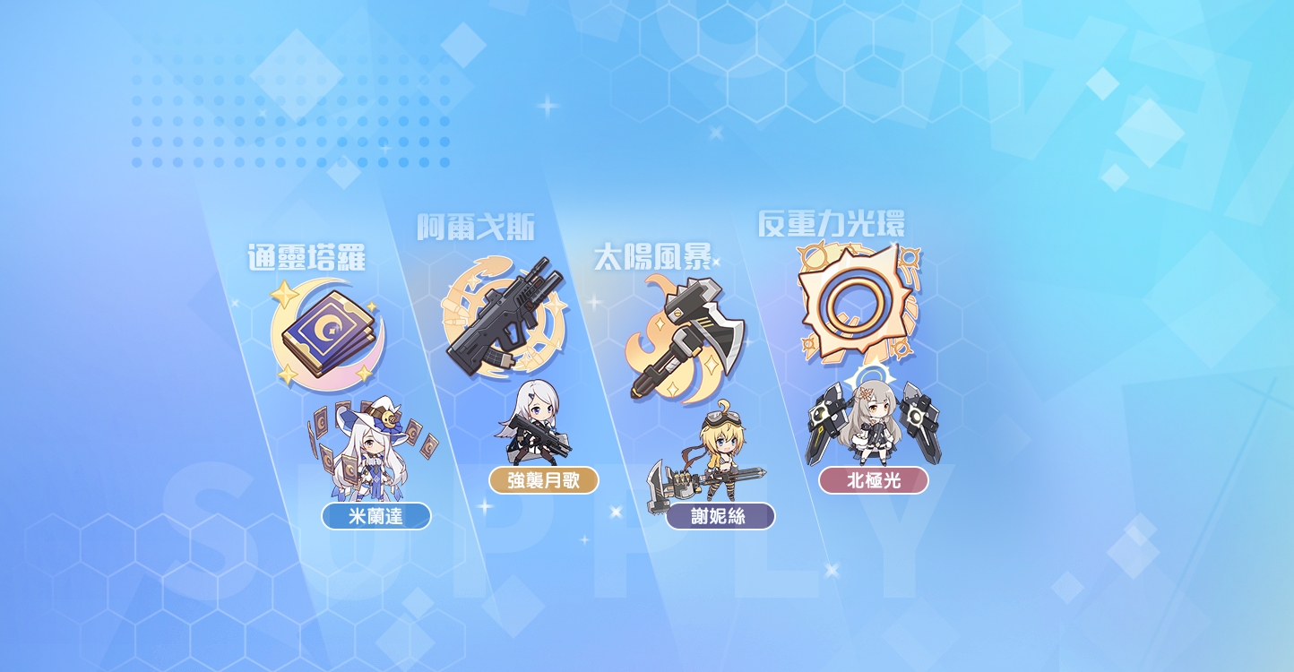 2、核心卡池【遺世獨立者】限時開啟:使徒米蘭達-通靈塔羅、強襲月歌-阿爾戈斯、烈陽謝妮絲-太陽風暴、北極光-反重力光環;