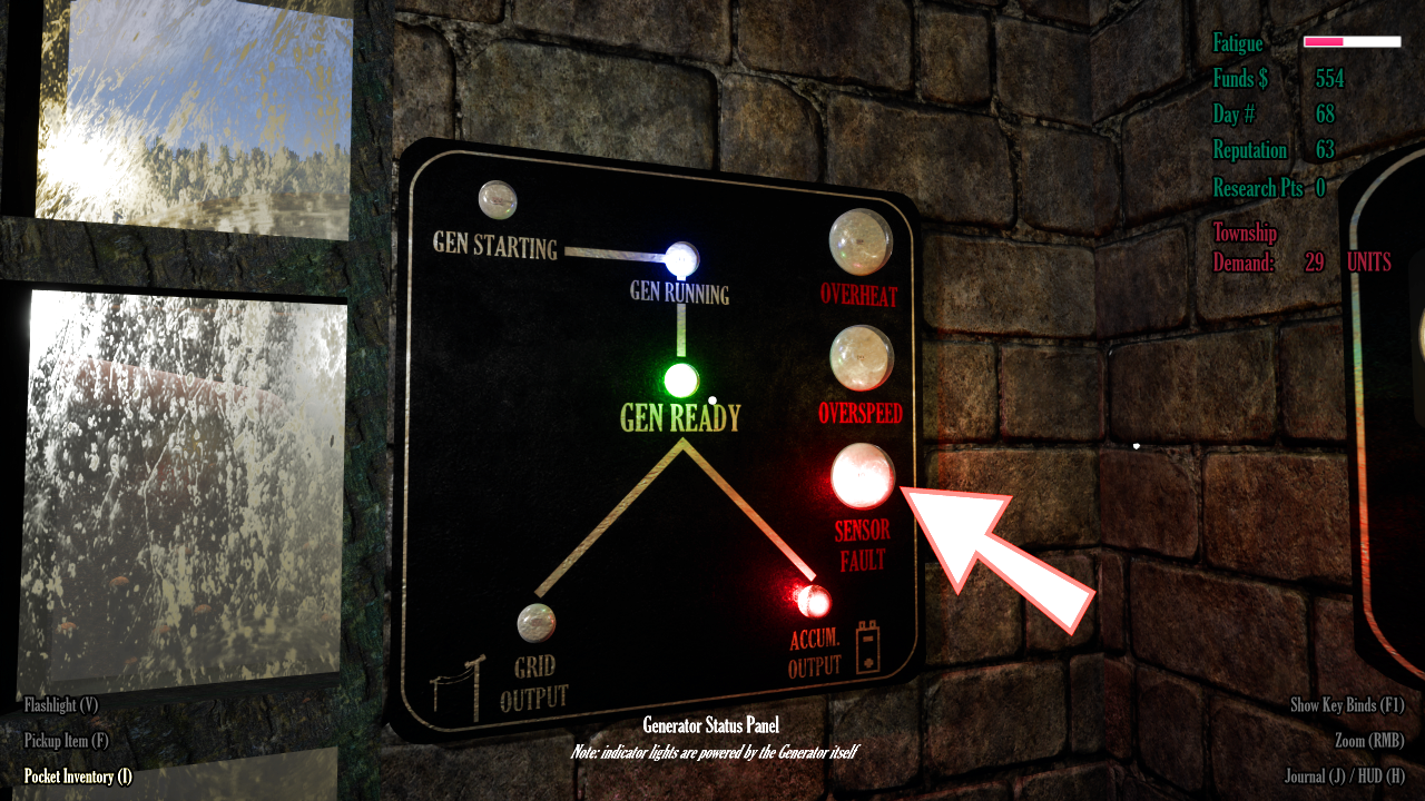 If any of the sensors above fail (or are removed), a new 'Sensor Fault' warning lamp will soon light-up on the Generator Status Panel (note however that this lamp only works if the Generator is spinning as the lamp itself is powered by the Generator like the other lamps on this panel). Also note that the 'Sensor Fault' lamp can take some time to react to either a sensor failing/going missing, or an existing failed/missing sensor being replaced. Just give it some time and it should soon update appropriately. :)