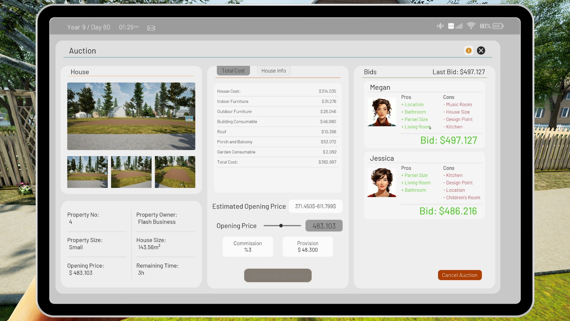 • Roof, Porch, Balcony, Garage, Pool, and Outdoor Furniture (Garden) now affect auction calculations.