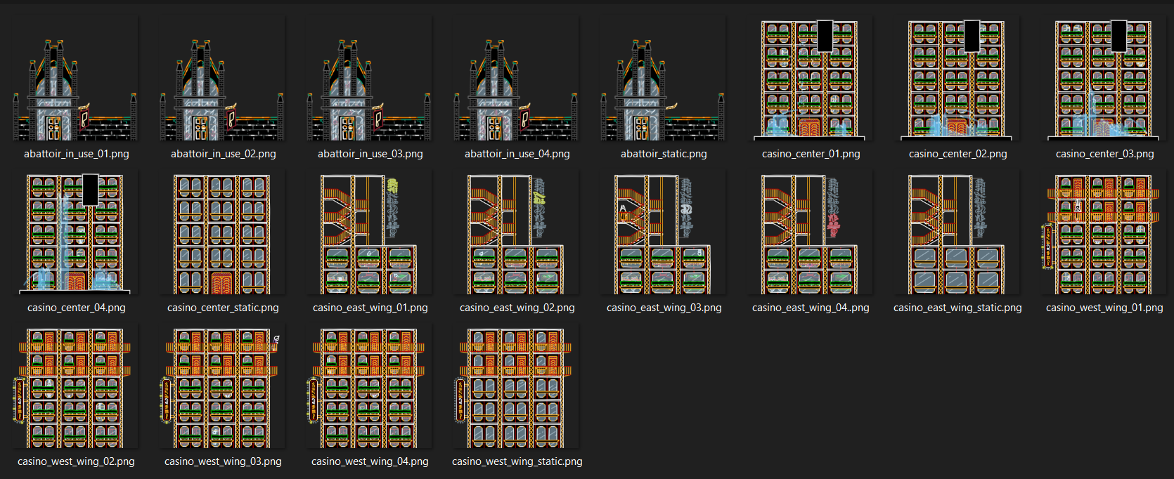 Here is all of the structure art that I have to import. The Abattoir was finished a while ago, but isn't yet in the game. As you can see, doing the Casino alone is as much art as at least 3 of the smaller buildings. This is made worse by the fact that it is a much larger size building, per unit. Its more like 9 times the work.