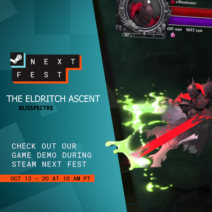 Demo for "The Eldritch Ascent" will be uploaded a few days prior to Steam's Next Fest October 13th-20th Make sure to wishlist and follow the store page for the new demo release.