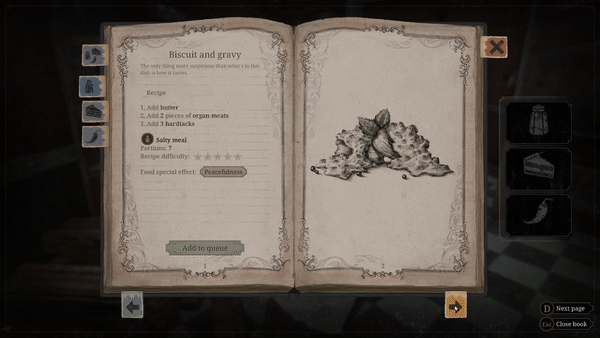 From her recipe book, you can select up to three dishes – one from each category: sweet, salty, and spicy. In the cooking queue on the right side, you can decide how many times she should prepare a given dish again after the pot becomes empty.