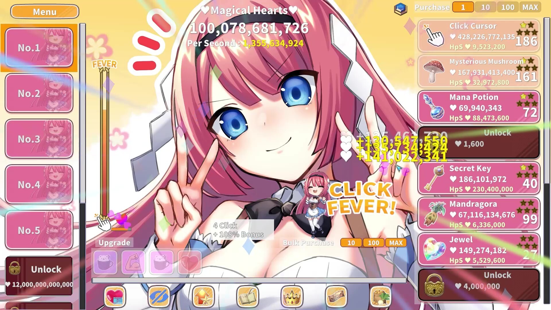 Get tons of hearts in \[Fever Mode] triggered by rapid clicking and unlock cute girls animations!