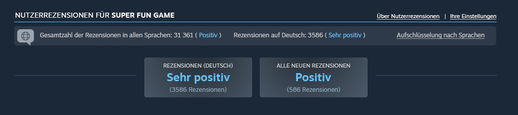 This change impacts games that have more than 2,000 publicly visible reviews, and with at least 200 written reviews in at least one language. We purposely made these thresholds higher than the 10 reviews required to calculate the Overall Review Score; this is because we wanted to be pretty confident in the language-specific score before showing it to users.