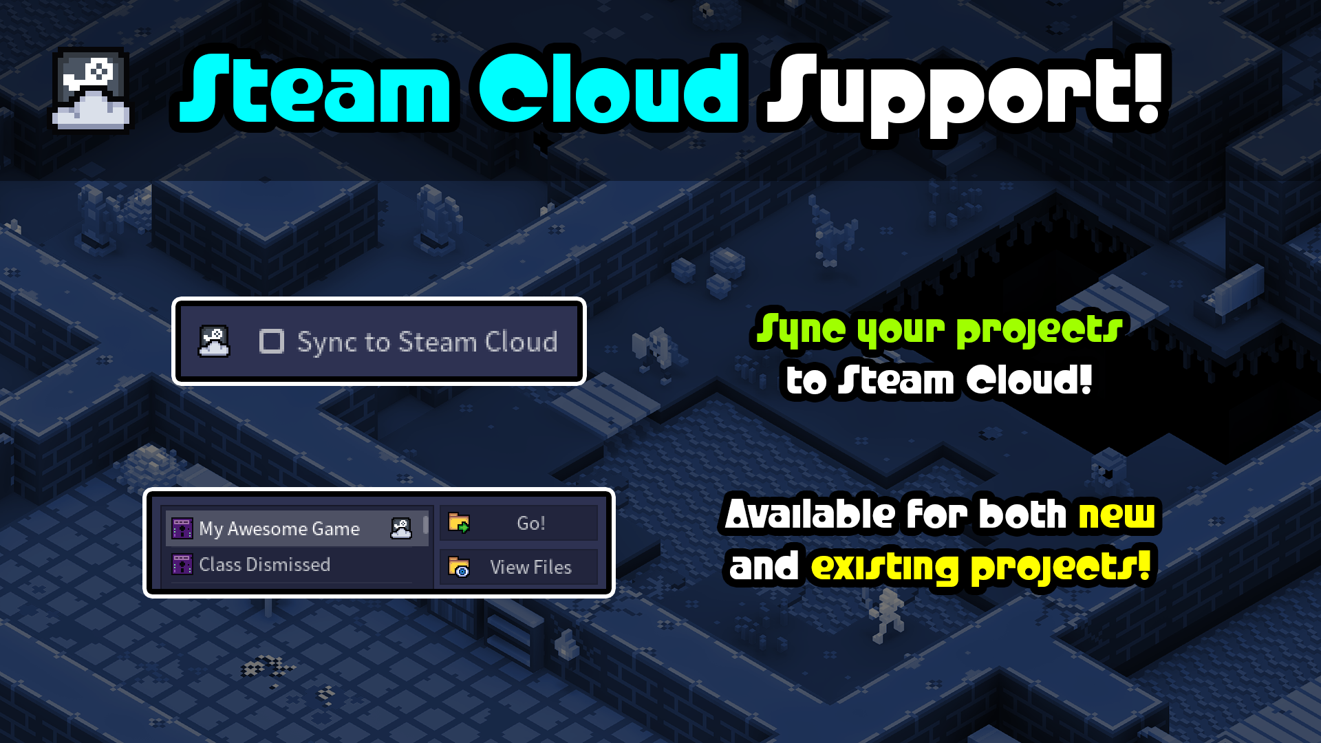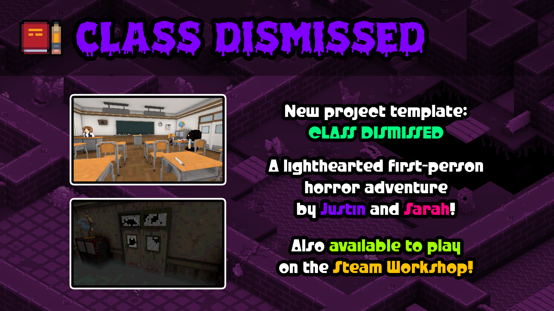 This update also comes with Steam Cloud support, which lets you sync your game projects to the cloud, as well as a new project template called "Class Dismissed", a lighthearted horror adventure created as a collaboration between me and Sarah using her school assets.