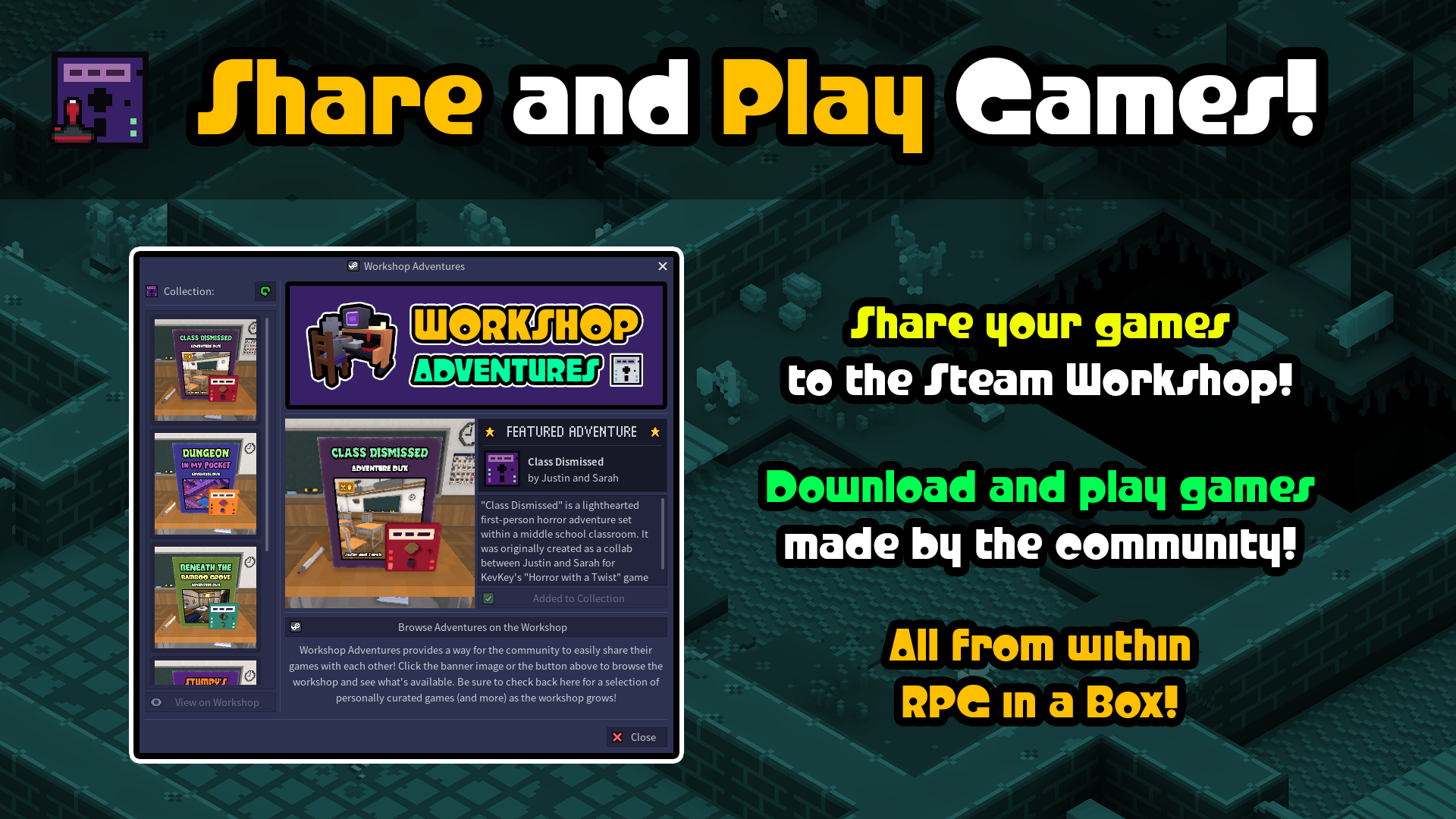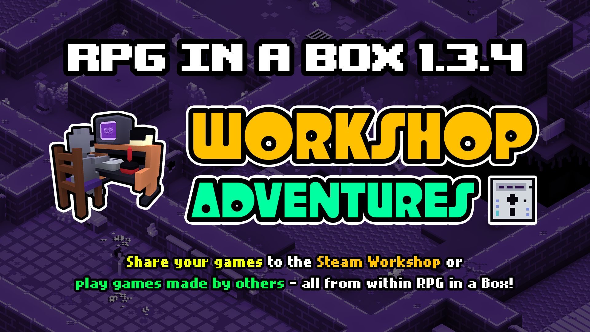 Hi everyone! In case you missed it, the Workshop Adventures update is out now! With this release, you can now share your games directly to the Steam Workshop, and play other people's games, all from the comfort of RPG in a Box! There are already 24 games out there waiting to be played, and I look forward to seeing it grow as more people share theirs! Have you made a game with RPG in a Box? Consider sharing it for the community to play!