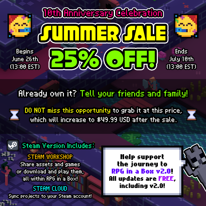 So excited to announce that, in celebration of its 10th anniversary and the Workshop Adventures release, RPG in a Box is 25% OFF for the Steam Summer Sale!