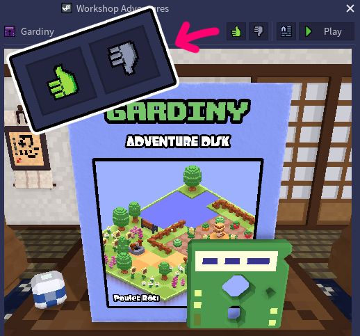 Release v1.3.4.2 is out now! This features a few small updates, most notably the ability to rate Steam Workshop games directly from RPG in a Box! The game featured in the screenshot below is Gardiny by creator Poulet Rôti. Gardiny is a relaxing game where you take care of a garden at your own pace!