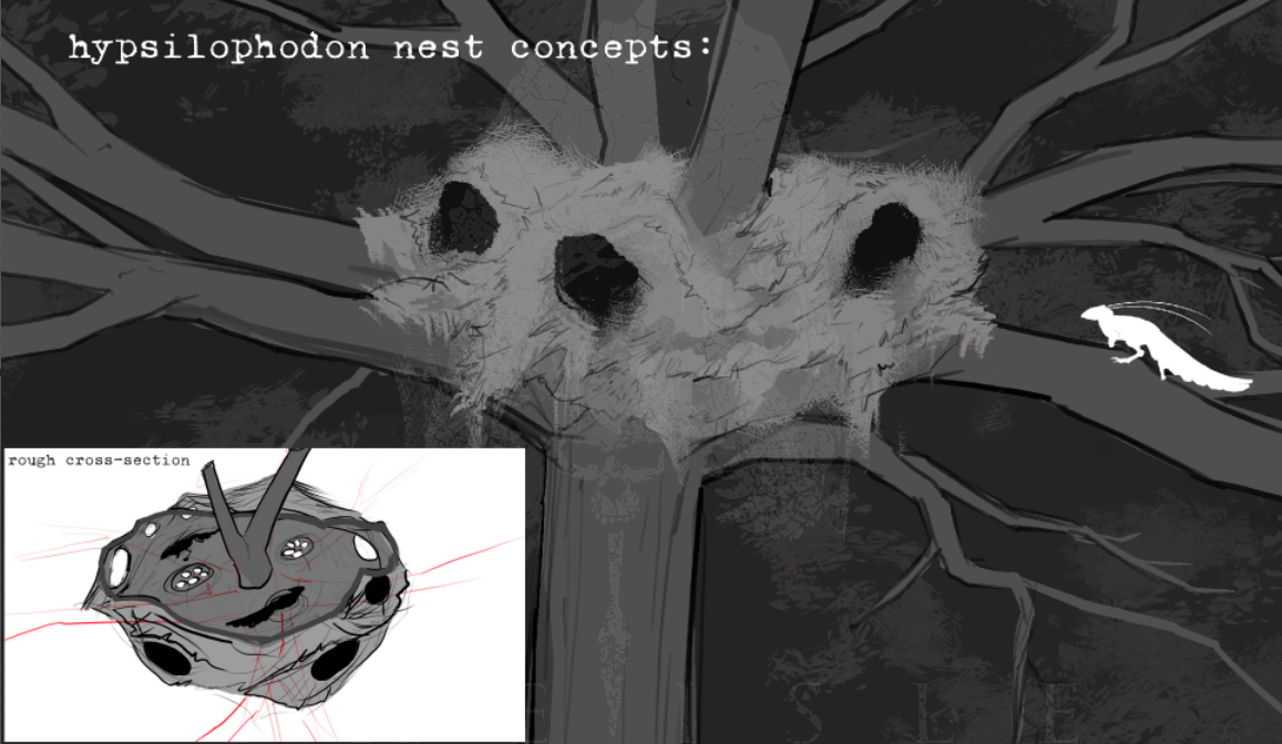 The other notable visual change you may see is that the old prototype ceiba trees have been replaced with final versions. There are a few edits to the branch materials that may result in a few tree species having slightly abnormal color for a build or two, but the jungle feels great both on the ground and to fly through. Hypsilophodons may look forward to potential communal building in the largest of the jungle trees, as well as some increased climbing capabilities to assist it further without it becoming impossible for herrerasaurus to catch. Concepts courtesy of Tapwing. Hypsilophodon can now mock you from its own family tree.
