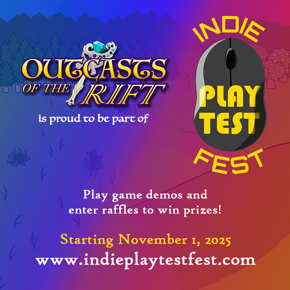 Outcasts of the Rift is participating in Indie Playtest Fest in 2025. Play free demos of indie games in development, give feedback and earn rewards!