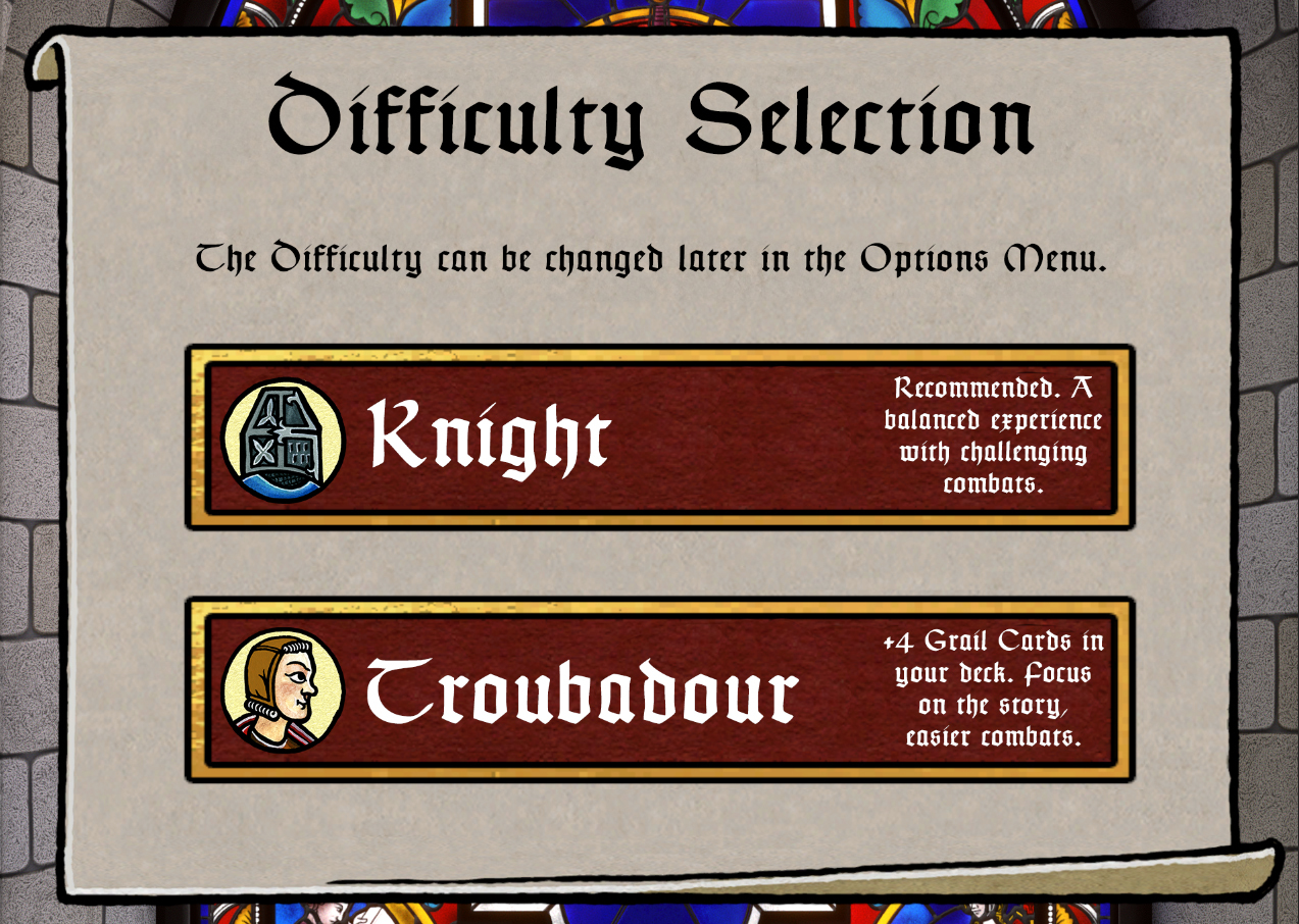 When creating a new game, you can now choose to play in Troubadour Mode, which will add 4 extra grail cards to your deck. The intention is to create a way for players more interested in the story and the narrative to have an easier time getting through challenges and combats. We're still testing this out so please let us know if you think it needs more tweaking.