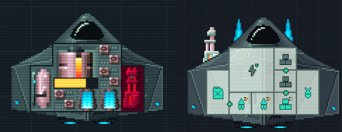 One of the first things I wanted to take a look at was how the insides of the ships are drawn. In `alpha 1` I used sprites showing all the parts inside the ship. This looked cool but made it hard to see what was inside the ship vs. what was outside. In `alpha 2` the parts are represented by icons. The icon colour shows the damage level, the borders of the cells clearly show the grid and I can also show if a ship part is powered or not by changing the background.