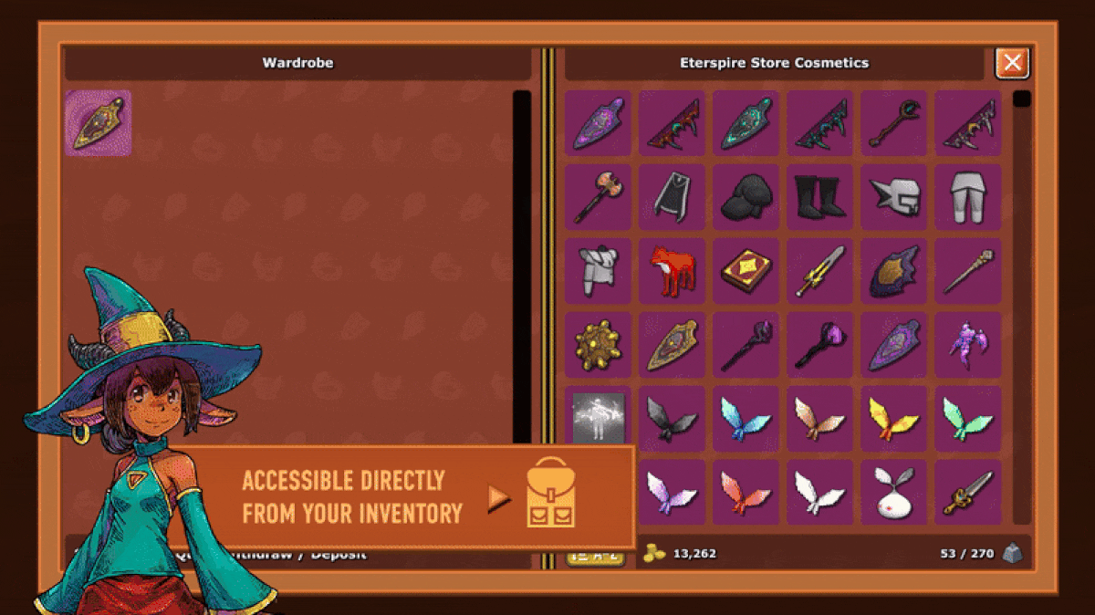 • Introducing the Wardrobe! The old Cosmetics tab in your bank is now called the Wardrobe, and it is also accessible directly from your Inventory. Use it to store weightless cosmetics that you do not use as frequently, helping you keep your inventory clean and making it easier to organize your favorite cosmetics. Since you can access the Wardrobe from anywhere, you can change your look at any time you like!
