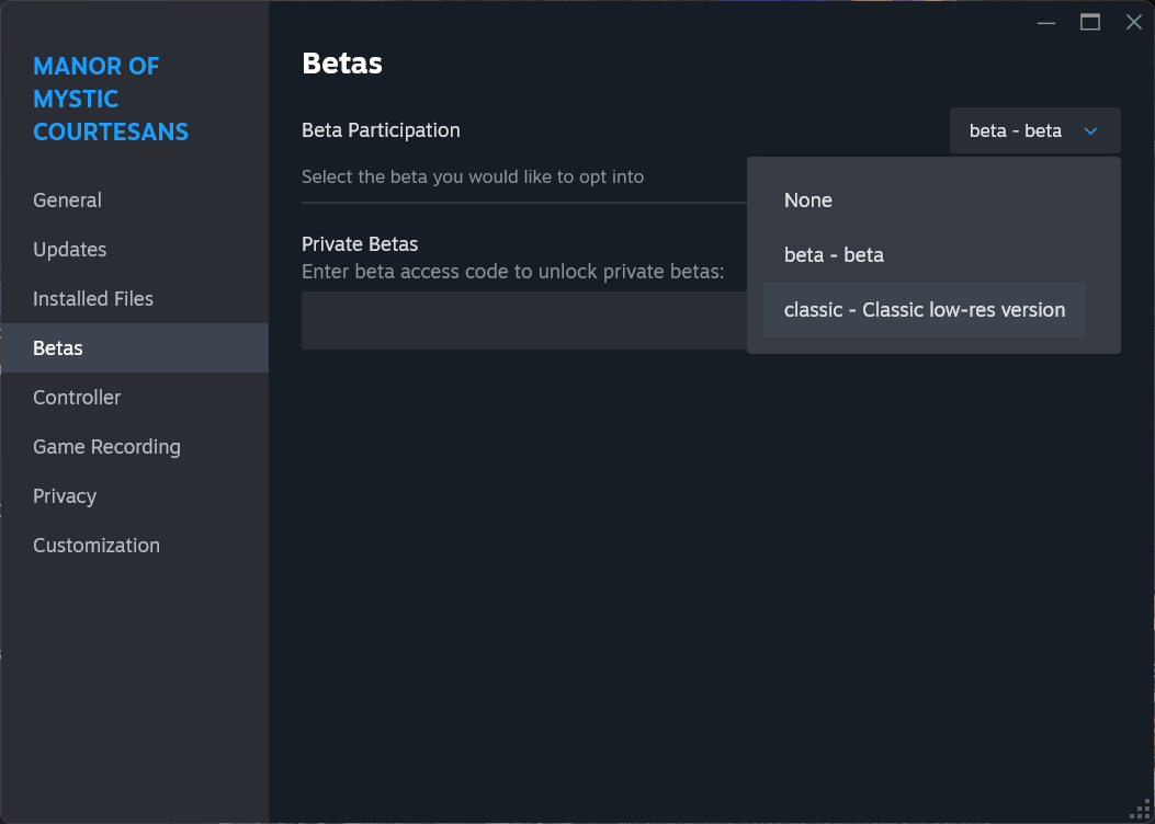 *Due to the higher screen resolution, the game’s system requirements have increased and save data from previous versions is no longer compatible. If you wish to revert to the previous version, please open the game’s Properties, go to the Betas tab, and select “Classic low-res version.”