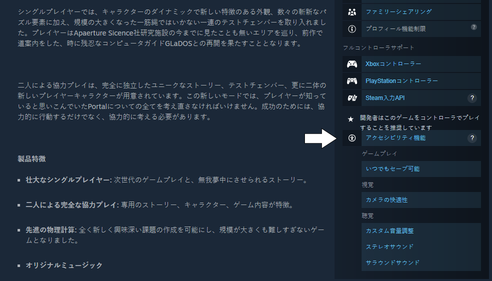 Accessibility features for a specific game are now visible on the right hand side of the store page