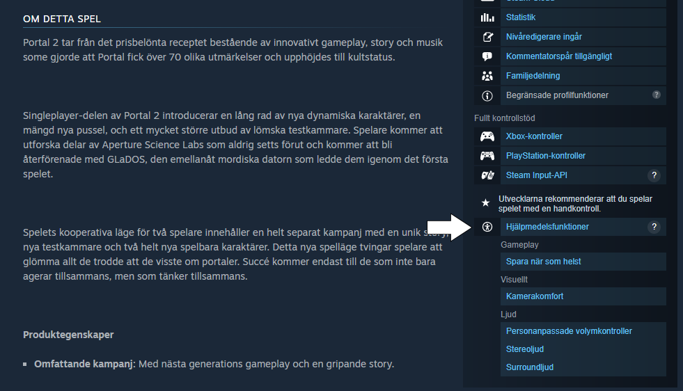 Accessibility features for a specific game are now visible on the right hand side of the store page