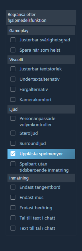 Steam now surfaces information on games with accessibility features as we aim to make it easier for players to find games with the support they need. This update comes after gathering valuable feedback from developers as well as players with disabilities, and over 5,000 applications have added details about their accessibility support (with more developers updating their games each day).