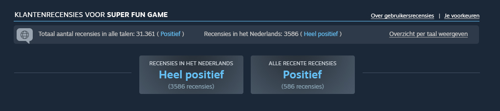This change impacts games that have more than 2,000 publicly visible reviews, and with at least 200 written reviews in at least one language. We purposely made these thresholds higher than the 10 reviews required to calculate the Overall Review Score; this is because we wanted to be pretty confident in the language-specific score before showing it to users.