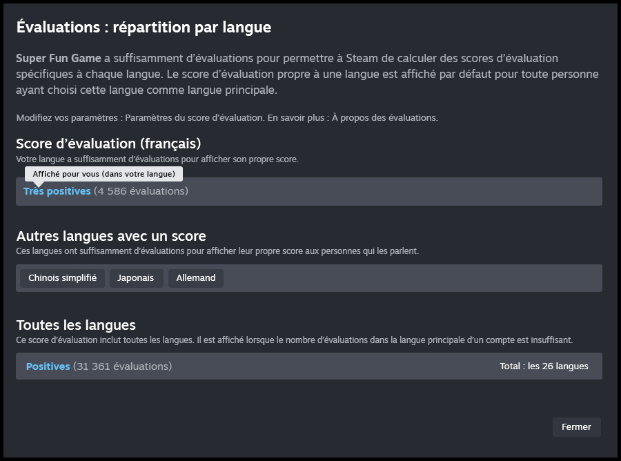 This change impacts games that have more than 2,000 publicly visible reviews, and with at least 200 written reviews in at least one language. We purposely made these thresholds higher than the 10 reviews required to calculate the Overall Review Score; this is because we wanted to be pretty confident in the language-specific score before showing it to users.