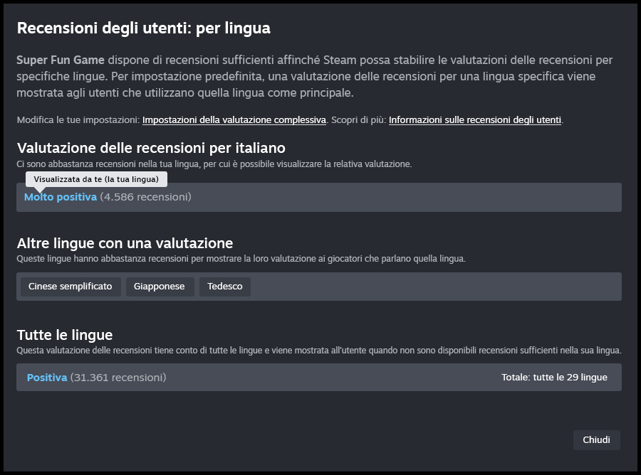This change impacts games that have more than 2,000 publicly visible reviews, and with at least 200 written reviews in at least one language. We purposely made these thresholds higher than the 10 reviews required to calculate the Overall Review Score; this is because we wanted to be pretty confident in the language-specific score before showing it to users.