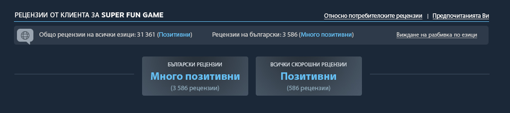 With today's update, the Review Score shown to you for some games will be calculated from the reviews written in your language. This is part of our ongoing effort to ensure that Steam User Reviews are helping customers make informed decisions when considering the purchase of a new game. Read on for the details behind this change.