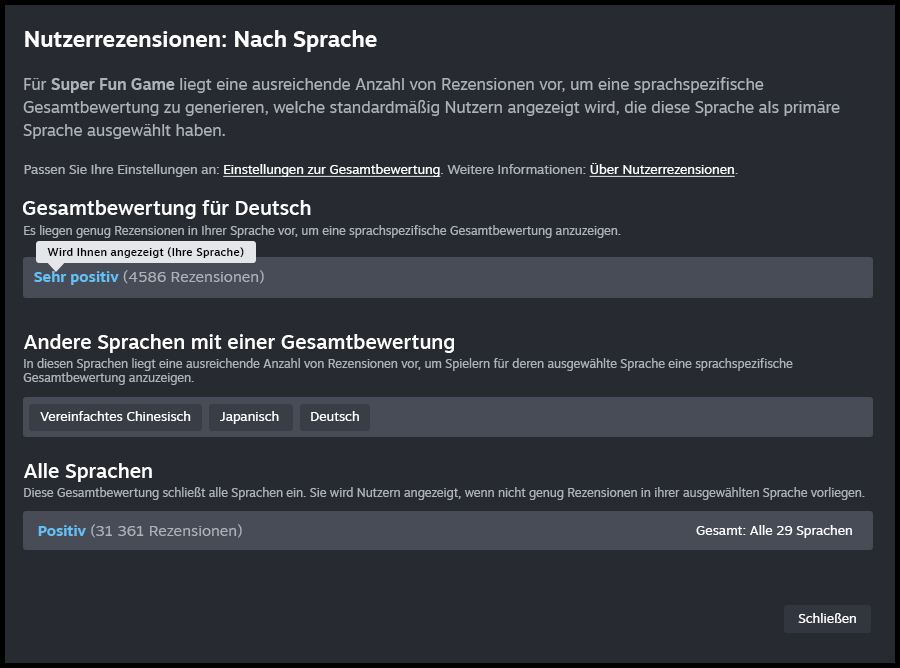 This change impacts games that have more than 2,000 publicly visible reviews, and with at least 200 written reviews in at least one language. We purposely made these thresholds higher than the 10 reviews required to calculate the Overall Review Score; this is because we wanted to be pretty confident in the language-specific score before showing it to users.