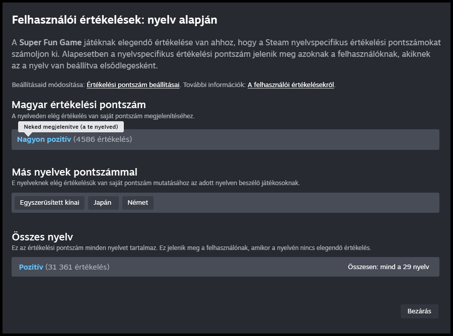 Steam's growth since then into an even larger global presence means customers in different regions of the world may have vastly different experiences from each other for the same game. There are a variety of reasons this may happen for a particular game, including translation issues, cultural references, poor network connections, and many others; things that the Overall Review Scores haven't been able to capture until now. Calculating a language-specific review score means that we can better distill the sentiment of these different groups of customers, and in doing so, better serve potential customers that belong to those groups.