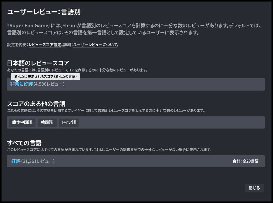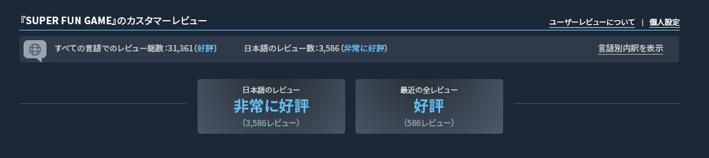 This change impacts games that have more than 2,000 publicly visible reviews, and with at least 200 written reviews in at least one language. We purposely made these thresholds higher than the 10 reviews required to calculate the Overall Review Score; this is because we wanted to be pretty confident in the language-specific score before showing it to users.