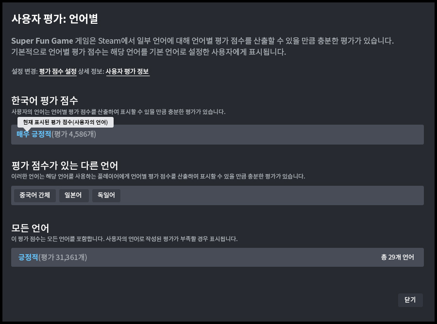 This change impacts games that have more than 2,000 publicly visible reviews, and with at least 200 written reviews in at least one language. We purposely made these thresholds higher than the 10 reviews required to calculate the Overall Review Score; this is because we wanted to be pretty confident in the language-specific score before showing it to users.