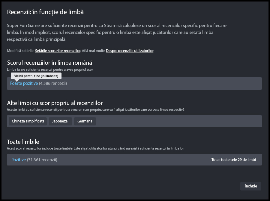 With today's update, the Review Score shown to you for some games will be calculated from the reviews written in your language. This is part of our ongoing effort to ensure that Steam User Reviews are helping customers make informed decisions when considering the purchase of a new game. Read on for the details behind this change.