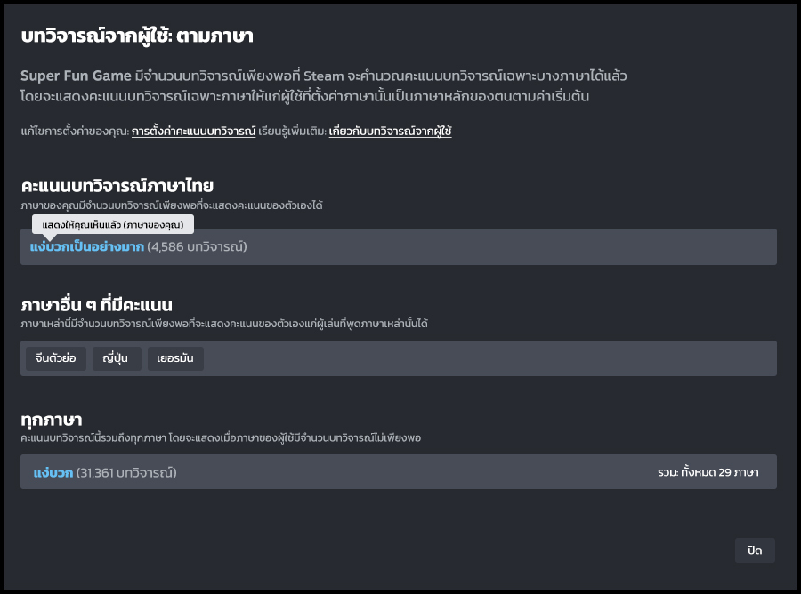 This change impacts games that have more than 2,000 publicly visible reviews, and with at least 200 written reviews in at least one language. We purposely made these thresholds higher than the 10 reviews required to calculate the Overall Review Score; this is because we wanted to be pretty confident in the language-specific score before showing it to users.