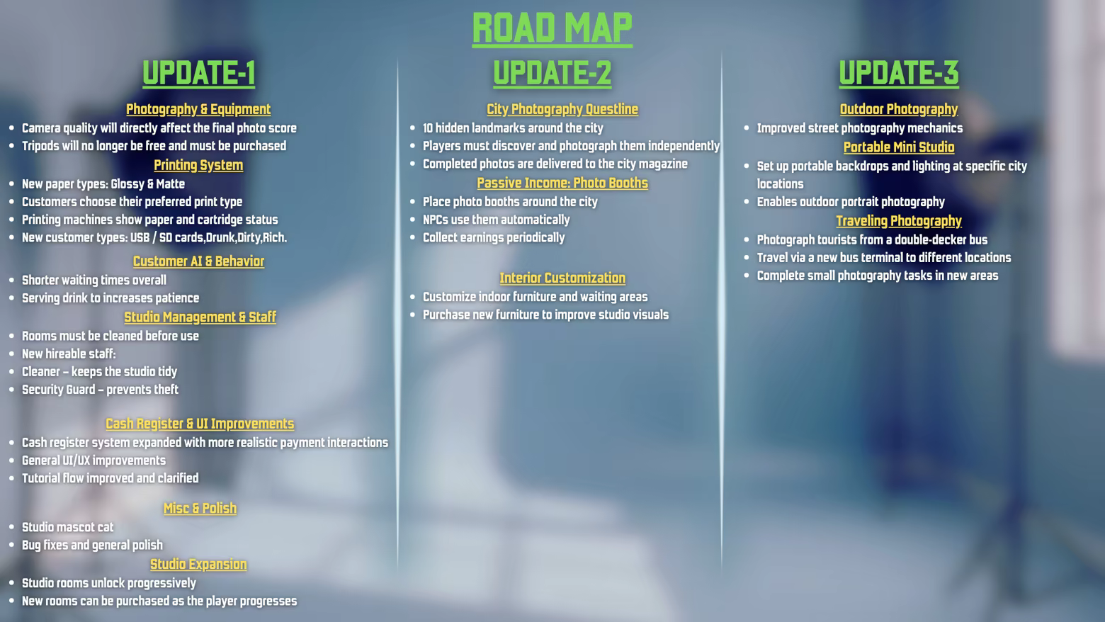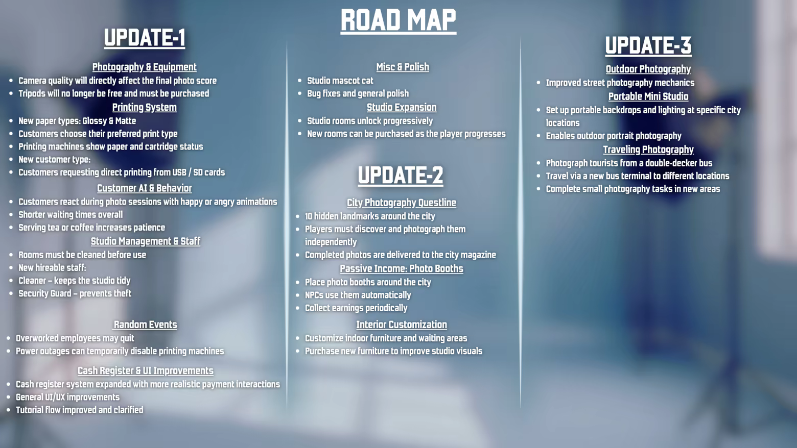Passion for photography, creativity and strategy come together! Live your dream and write your own success story with Photographer's Life Simulator. Your goal is simple: Build the best photo studio and make your name in history!