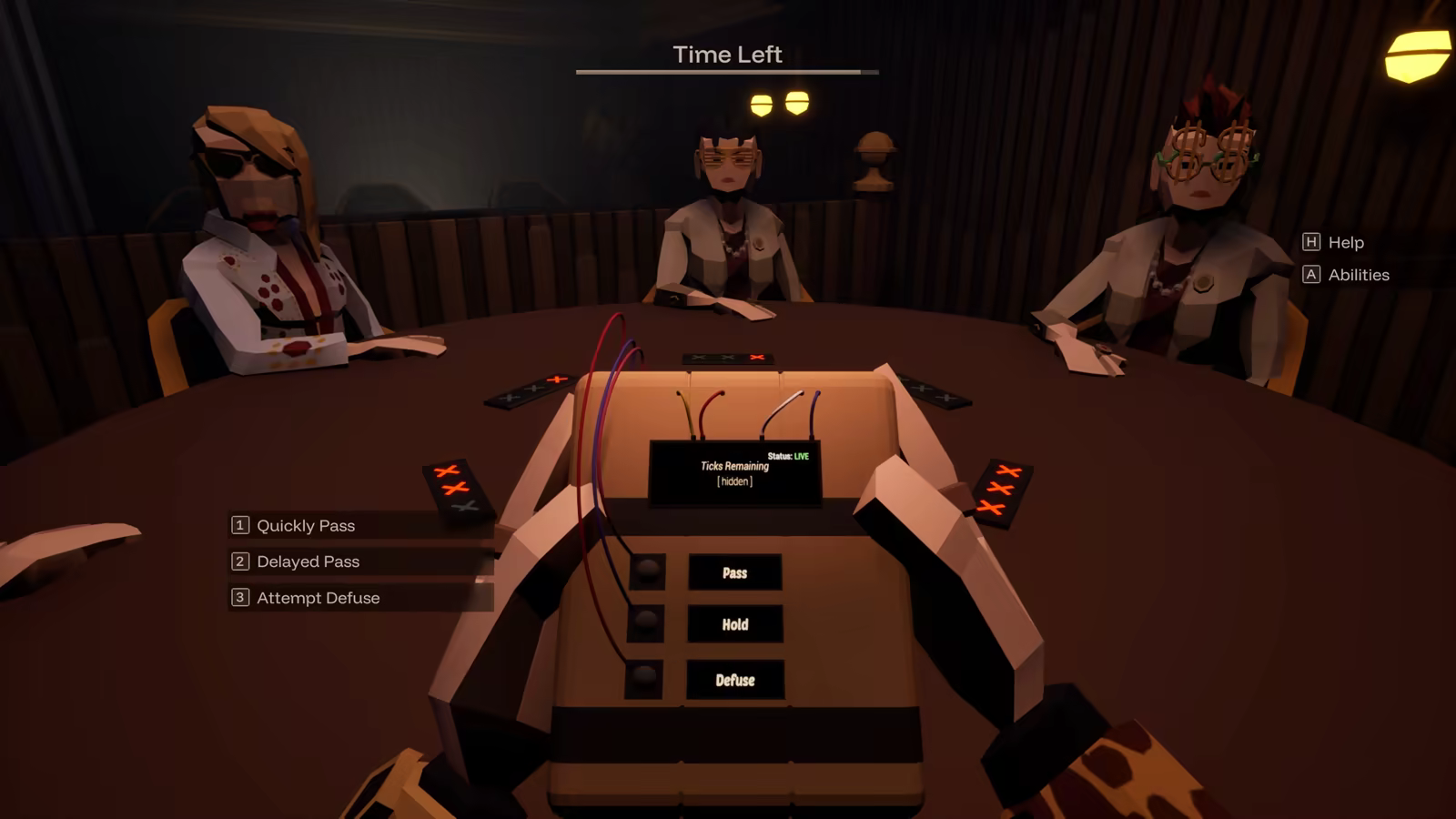 A live C4 is in play. Each turn, the bomb ticks closer to detonation. You can pass it, try to disarm it, or hold on and bluff your way through. Fail too many times and you earn strikes—three strikes and you're toast.
