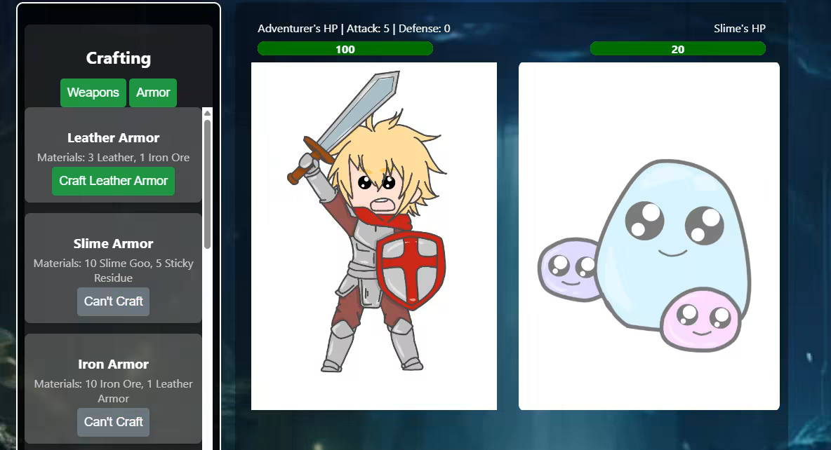 There is a automatic fighting mechanic where you click your "Fight Monster" button and it will start fighting the monster that you have selected, The monster and the player fight eachother until the monster is defeated and you will gain monster parts which you can then use to make weapons or armor.”