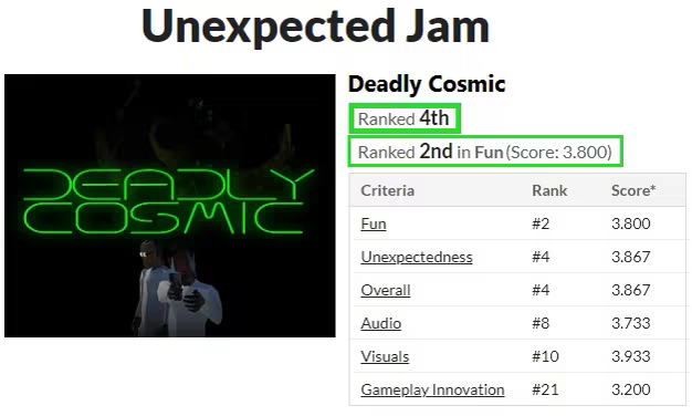 Deadly Cosmic is a short, but fun game inspired by the horror games from the 90s, made in 15 days for the Unexpected jam it earn the 4th place overall and 2nd place on Fun Category. This is a full version of the game, more polished and with many bugs fixed.