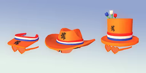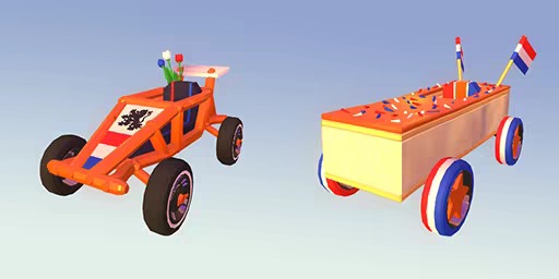 The pack features 3 helmets, 5 cool hats (3 with cool sunglasses), and one inflatable orange crown! On the zeepkist side we have 2 default zeepkists in orange styling, 1 tubeframe zeepkist with some tulips applied, an orange tompouce with Dutch sprinkles, an orange fireworks rocket, an orange lion, and a car based on 2021's King's Day in various colors!