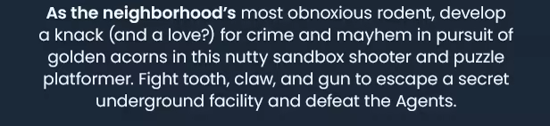Squirrel, meet gun. As the neighborhood’s most obnoxious rodent, develop a knack (and a love?) for crime and mayhem in pursuit of golden acorns in this nutty sandbox shooter and puzzle platformer. Fight tooth, claw, and gun to escape a secret underground facility and defeat the Agents.